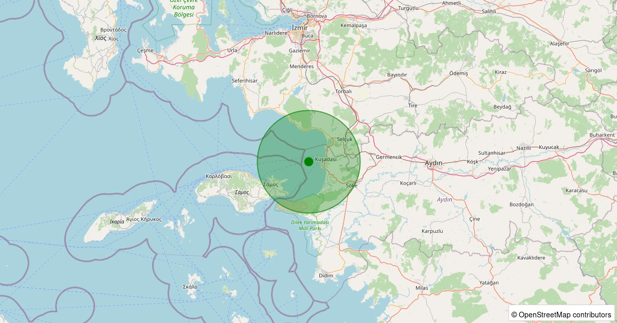 Son 7 gün içinde Ege Denizi - Kuşadası Körfezi - [06.03 km] Kuşadası (Aydın) noktasından 100 km yarıçap içerisinde meydana gelen diğer depremler:
