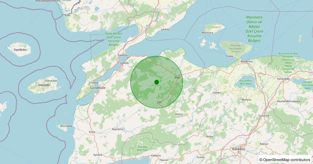 Son bir hafta içerisinde Çanakkale şehri Biga - Bezirganlar Köyü noktasından 100 km yarıçap içerisinde toplamda 248 deprem kaydedilmiştir. Bu depremlerden en büyüğü 3.4 büyüklüğünde ve en sığ odaklısı 0.00 kilometre derinlikte gerçekleşmiştir.