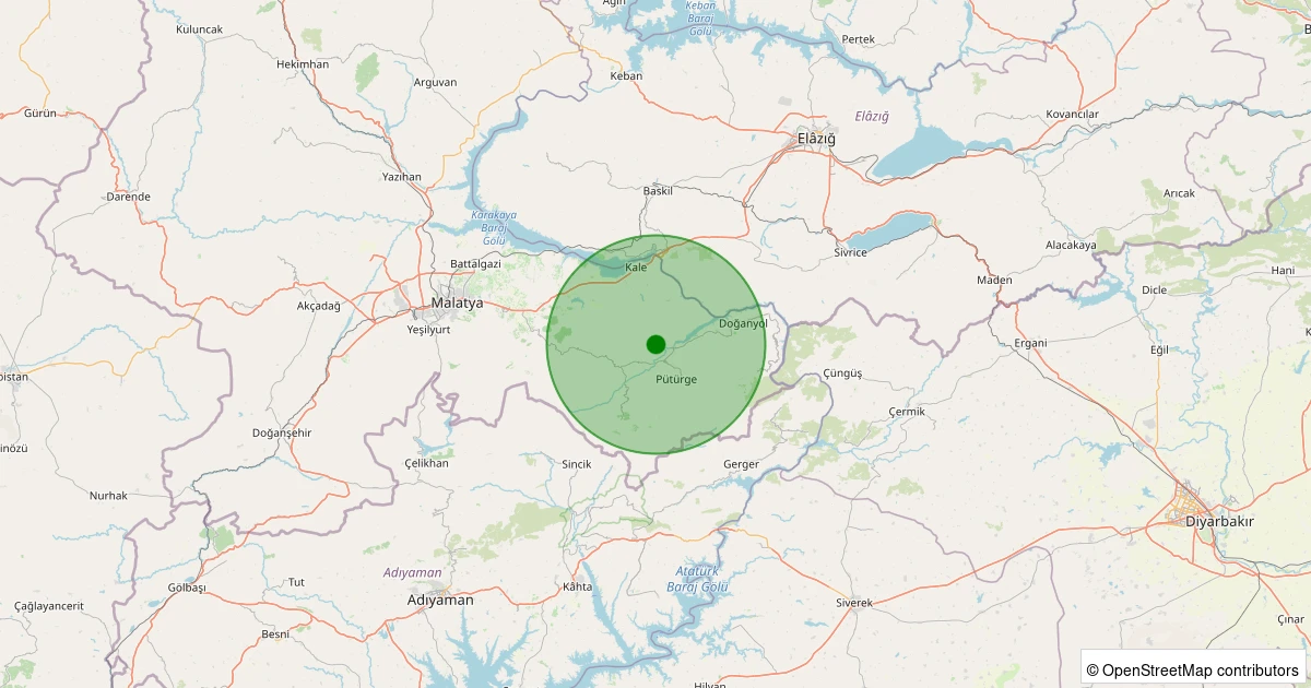 Son 7 gün içinde Pütürge - Aktarla Köyü noktasından 100 km yarıçap içerisinde meydana gelen diğer depremler: