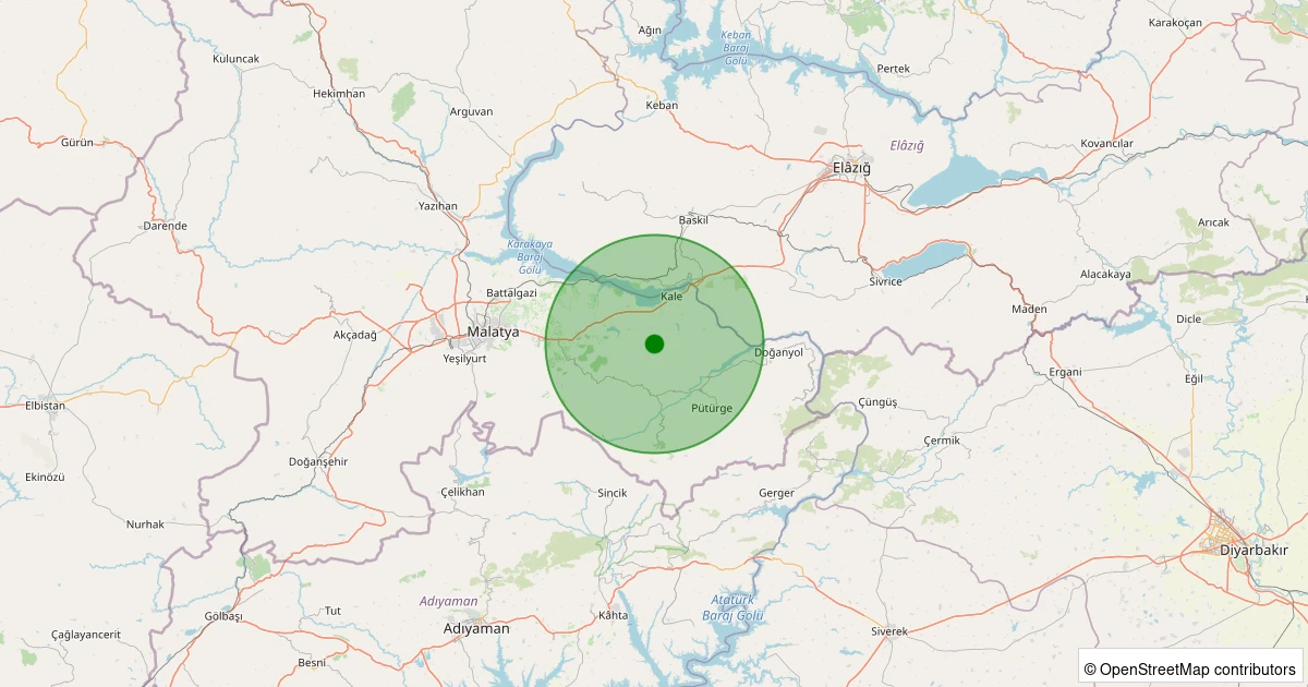 Son 7 gün içinde Pütürge - Pazarcık Köyü noktasından 100 km yarıçap içerisinde meydana gelen diğer depremler: