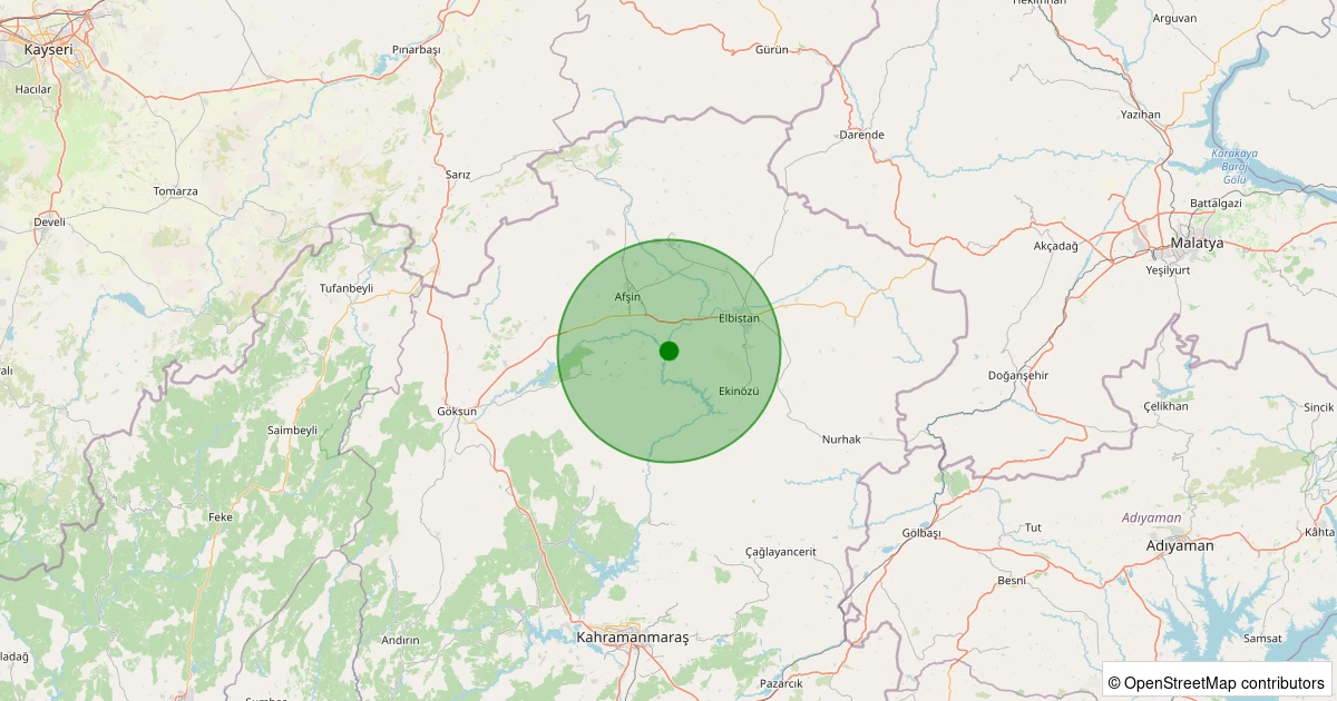 Son 7 gün içinde Elbistan - Dağdere Köyü noktasından 100 km yarıçap içerisinde meydana gelen diğer depremler: