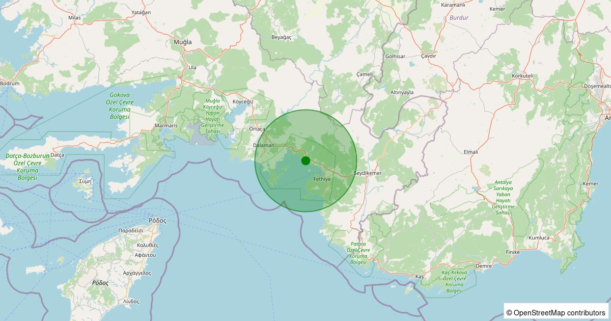 Son bir hafta içerisinde Akdeniz - Fethiye Körfezi - [02.57 km] Fethiye (Muğla) noktasından 100 km yarıçap içerisinde toplamda 62 deprem kaydedilmiştir. Bu depremlerden en büyüğü 2.9 büyüklüğünde ve en sığ odaklısı 3.40 kilometre derinlikte gerçekleşmiştir.