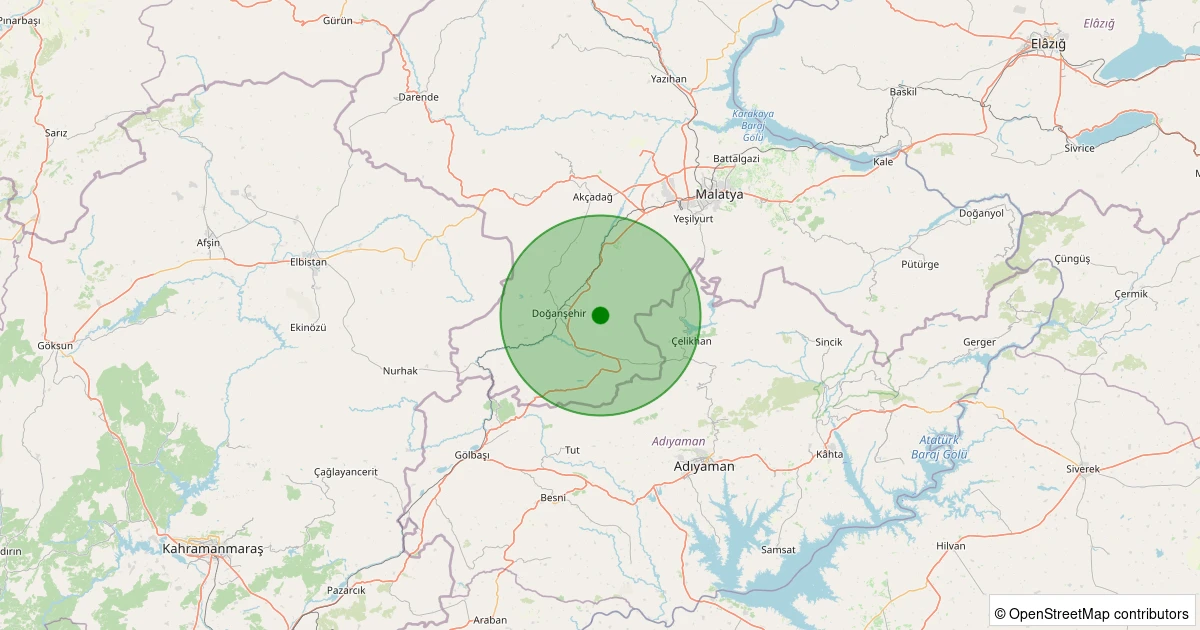 Son 7 gün içinde Doğanşehir - Güroba noktasından 100 km yarıçap içerisinde meydana gelen diğer depremler: