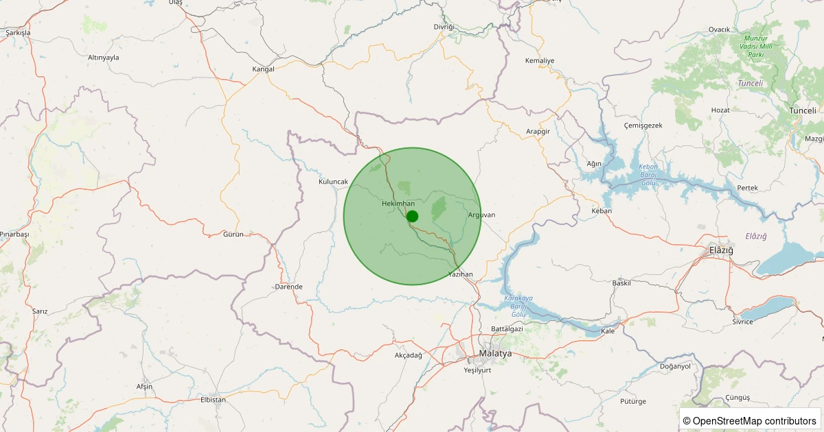 Son 7 gün içinde Hekimhan - Köprülü Mehmetpaşa noktasından 100 km yarıçap içerisinde meydana gelen diğer depremler: