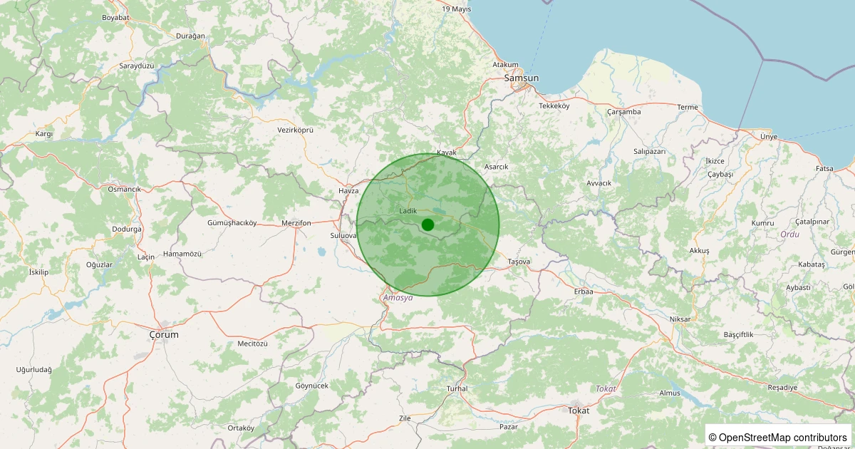 Son 7 gün içinde Ladik - Çakırgümüş noktasından 100 km yarıçap içerisinde meydana gelen diğer depremler: