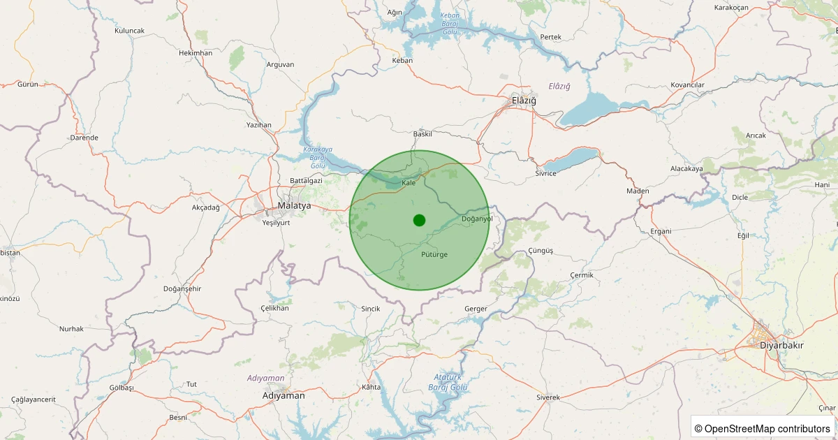 Son 7 gün içinde Pütürge - Karşıyaka Köyü noktasından 100 km yarıçap içerisinde meydana gelen diğer depremler: