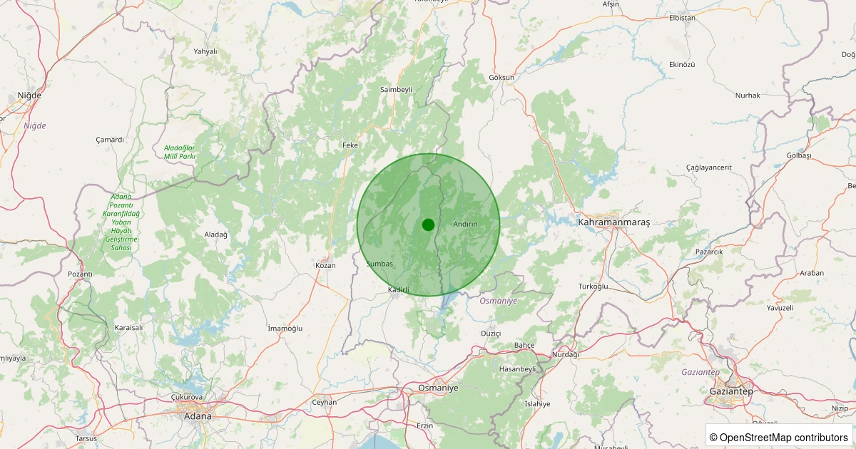 Son 7 gün içinde Kadirli - Yoğunoluk Köyü noktasından 100 km yarıçap içerisinde meydana gelen diğer depremler: