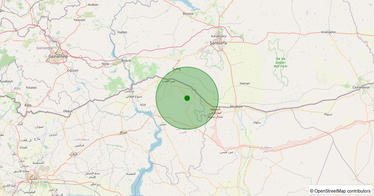 Son bir hafta içerisinde Ayn el-Arab, Halep (Suriye) - [11.03 km] Suruç (Şanlıurfa) noktasından 100 km yarıçap içerisinde toplamda 7 deprem kaydedilmiştir. Bu depremlerden en büyüğü 2.8 büyüklüğünde ve en sığ odaklısı 1.20 kilometre derinlikte gerçekleşmiştir.