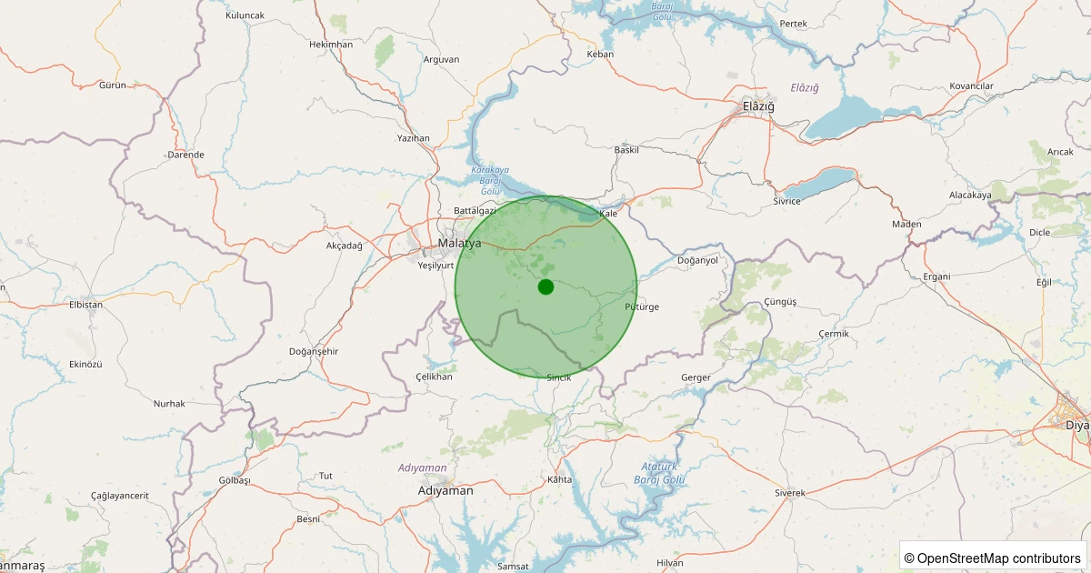 Son 7 gün içinde Pütürge - Söğütlü Köyü noktasından 100 km yarıçap içerisinde meydana gelen diğer depremler: