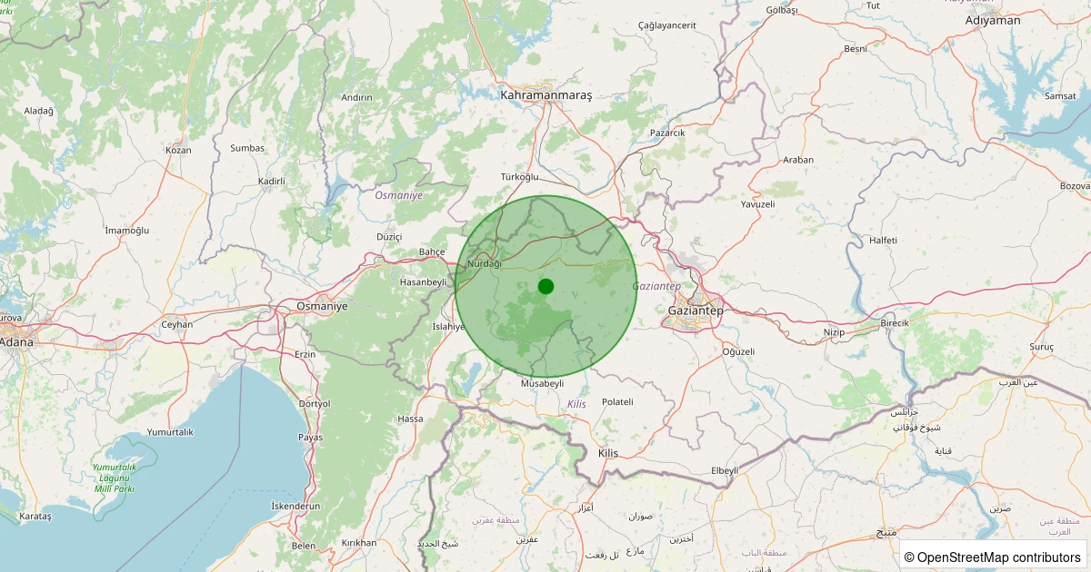Son bir hafta içerisinde Gaziantep şehri Nurdağı noktasından 100 km yarıçap içerisinde toplamda 67 deprem kaydedilmiştir. Bu depremlerden en büyüğü 3.6 büyüklüğünde ve en sığ odaklısı 0.00 kilometre derinlikte gerçekleşmiştir.