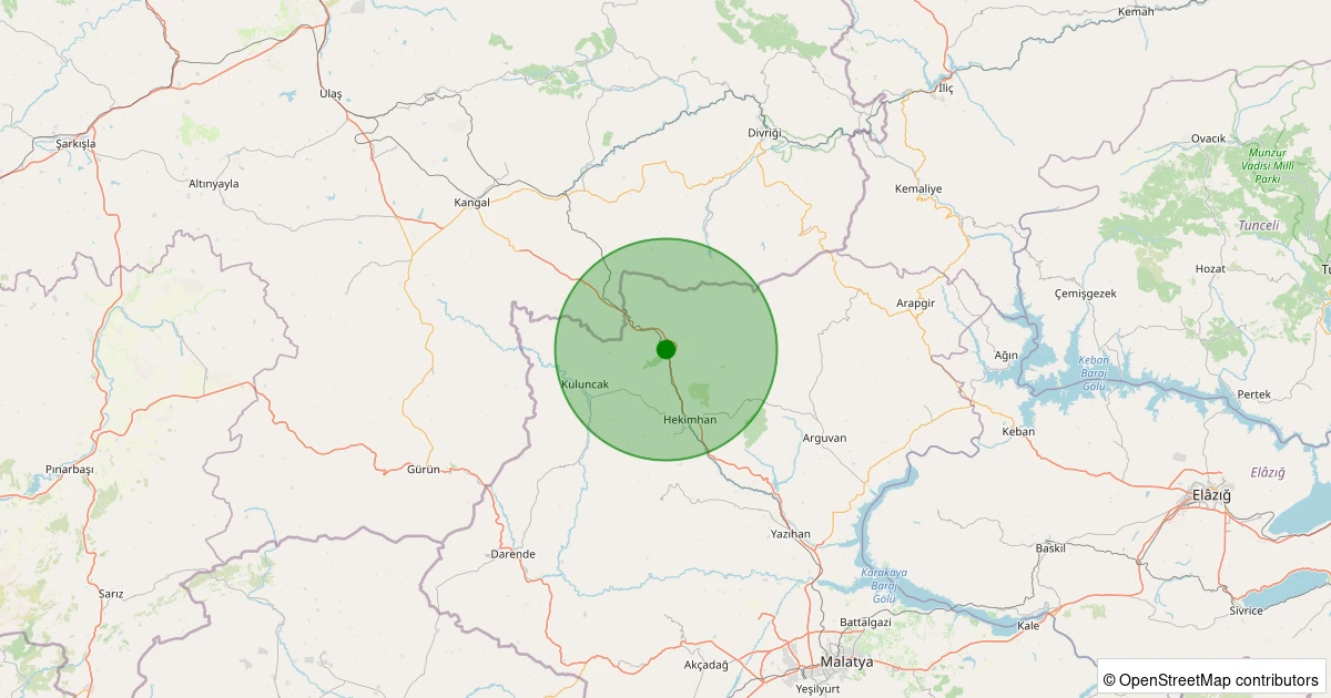Son 7 gün içinde Hekimhan - Hasançelebi Köyü noktasından 100 km yarıçap içerisinde meydana gelen diğer depremler: