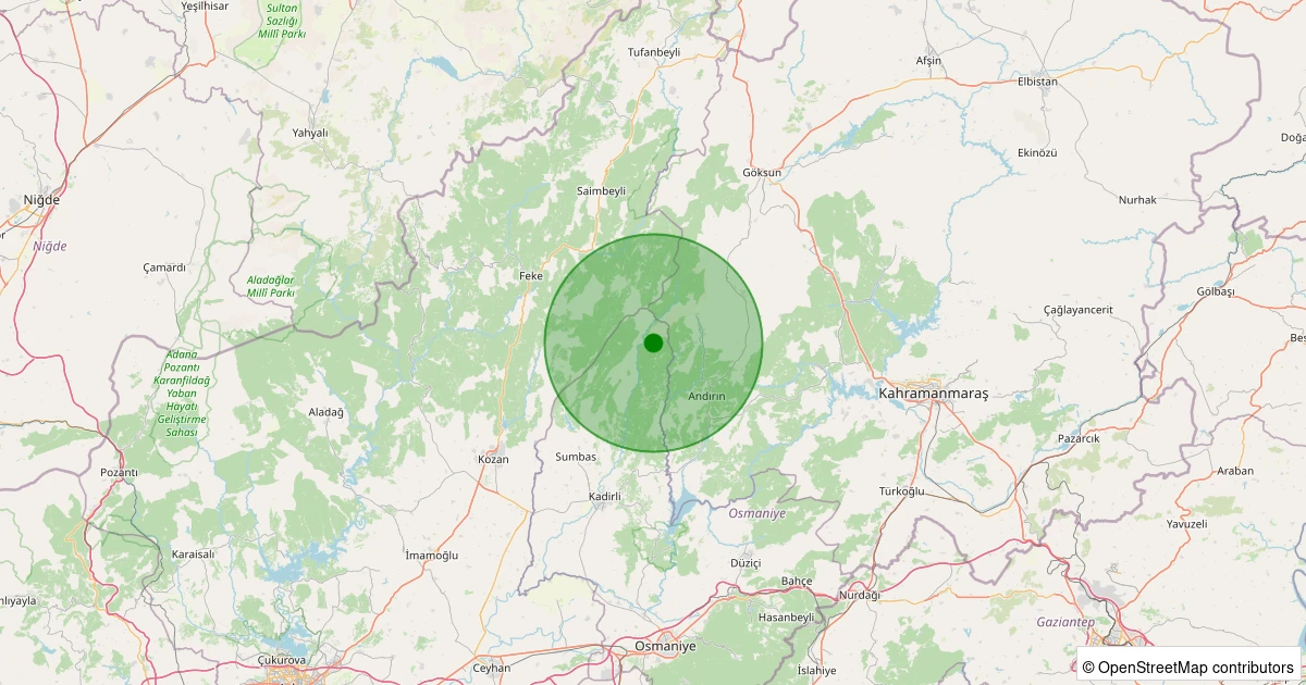 Son 7 gün içinde Kadirli - Değirmendere Köyü noktasından 100 km yarıçap içerisinde meydana gelen diğer depremler: