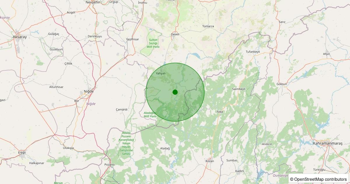 Son 7 gün içinde Yahyalı - Çamlıca noktasından 100 km yarıçap içerisinde meydana gelen diğer depremler: