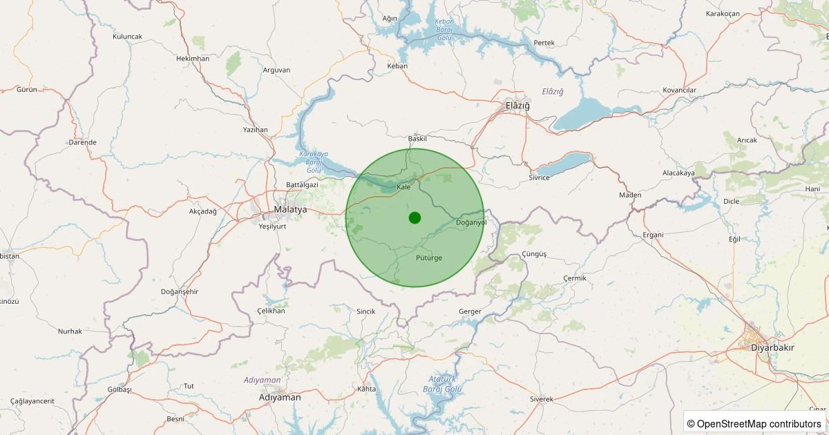 Son 7 gün içinde Pütürge - Bölükkaya Köyü noktasından 100 km yarıçap içerisinde meydana gelen diğer depremler: