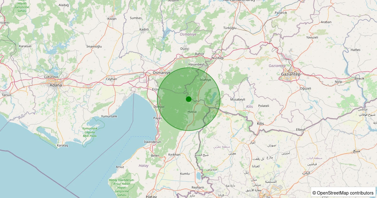 Son 7 gün içinde Hassa - Gazeluşağı Köyü noktasından 100 km yarıçap içerisinde meydana gelen diğer depremler: