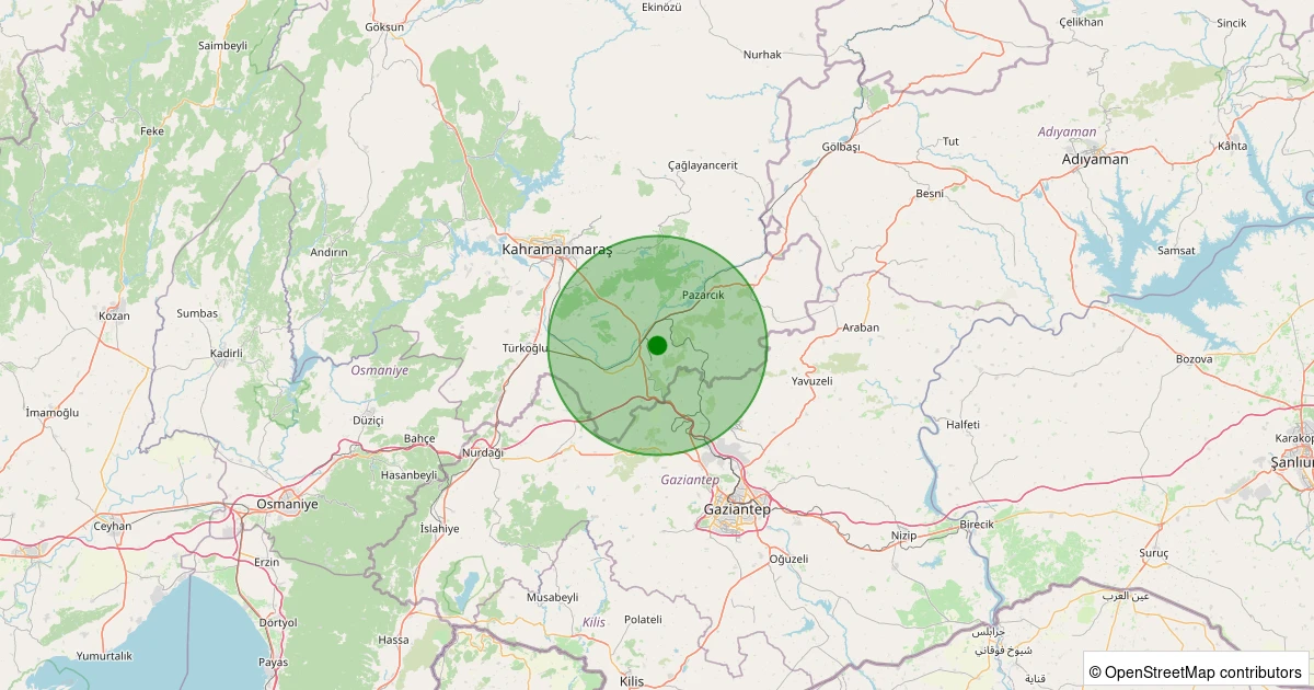 Son 7 gün içinde Pazarcık - Nefsidoğanlı noktasından 100 km yarıçap içerisinde meydana gelen diğer depremler:
