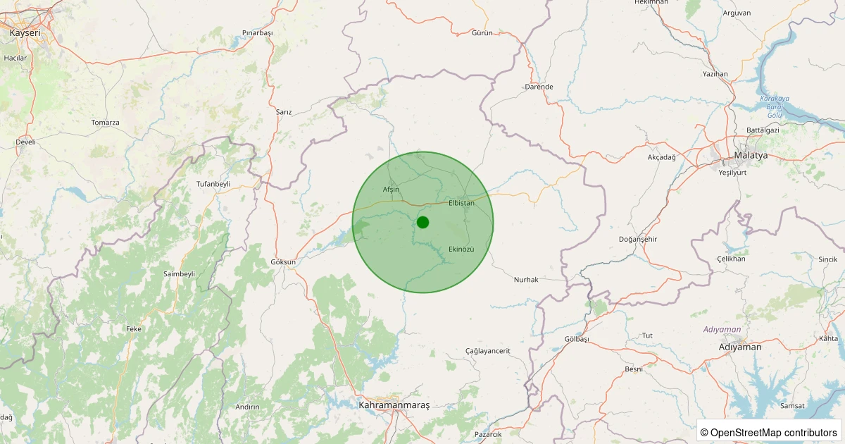 Son 7 gün içinde Elbistan - Dağdere Köyü noktasından 100 km yarıçap içerisinde meydana gelen diğer depremler: