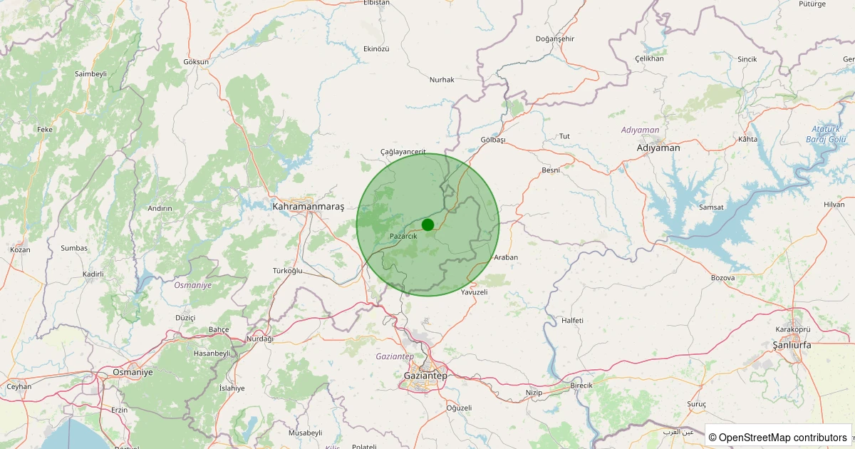 Son 7 gün içinde Pazarcık - Şallıuşağı noktasından 100 km yarıçap içerisinde meydana gelen diğer depremler: