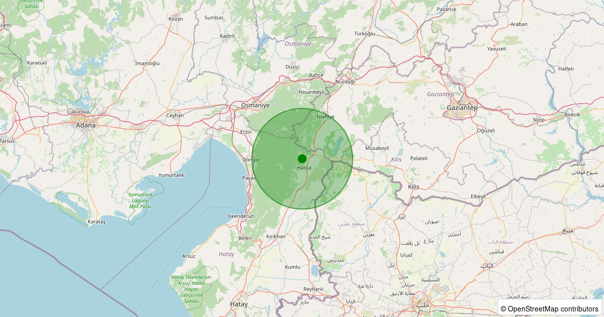 Son 7 gün içinde Hassa - Akbez Köyü noktasından 100 km yarıçap içerisinde meydana gelen diğer depremler: