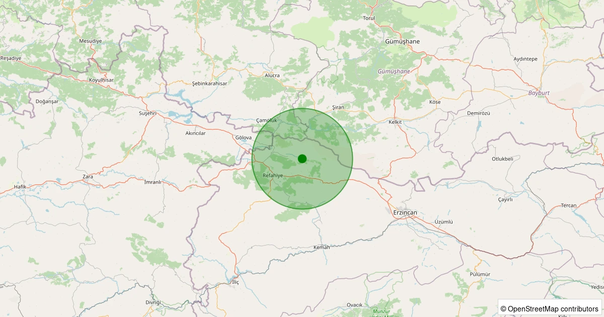 Son 7 gün içinde Refahiye - Armutlu Köyü noktasından 100 km yarıçap içerisinde meydana gelen diğer depremler: