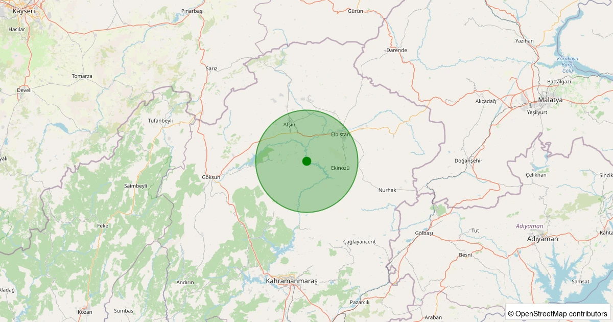 Son 7 gün içinde Elbistan - Dağdere Köyü noktasından 100 km yarıçap içerisinde meydana gelen diğer depremler: