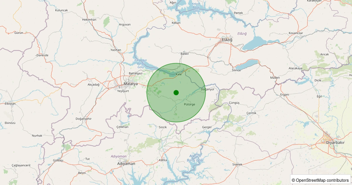 Son 7 gün içinde Pütürge - Pazarcık Köyü noktasından 100 km yarıçap içerisinde meydana gelen diğer depremler:
