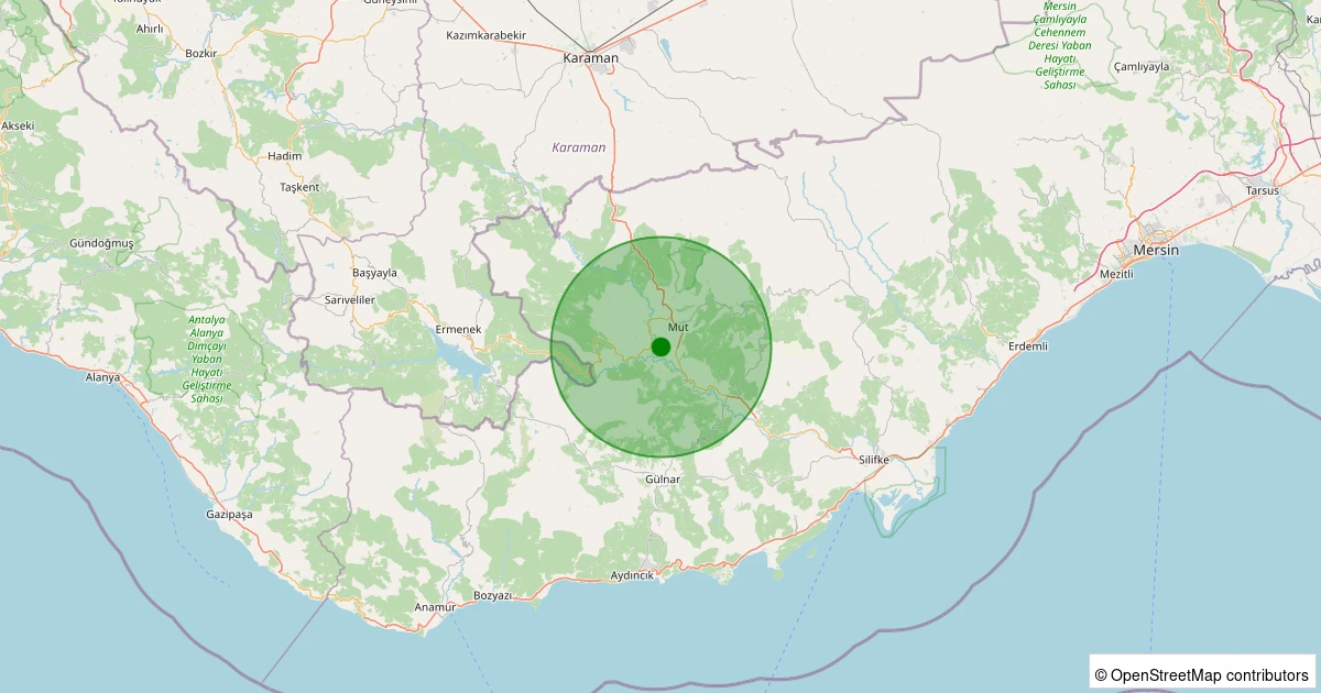 Son 7 gün içinde Mut - Mirahor Köyü noktasından 100 km yarıçap içerisinde meydana gelen diğer depremler: