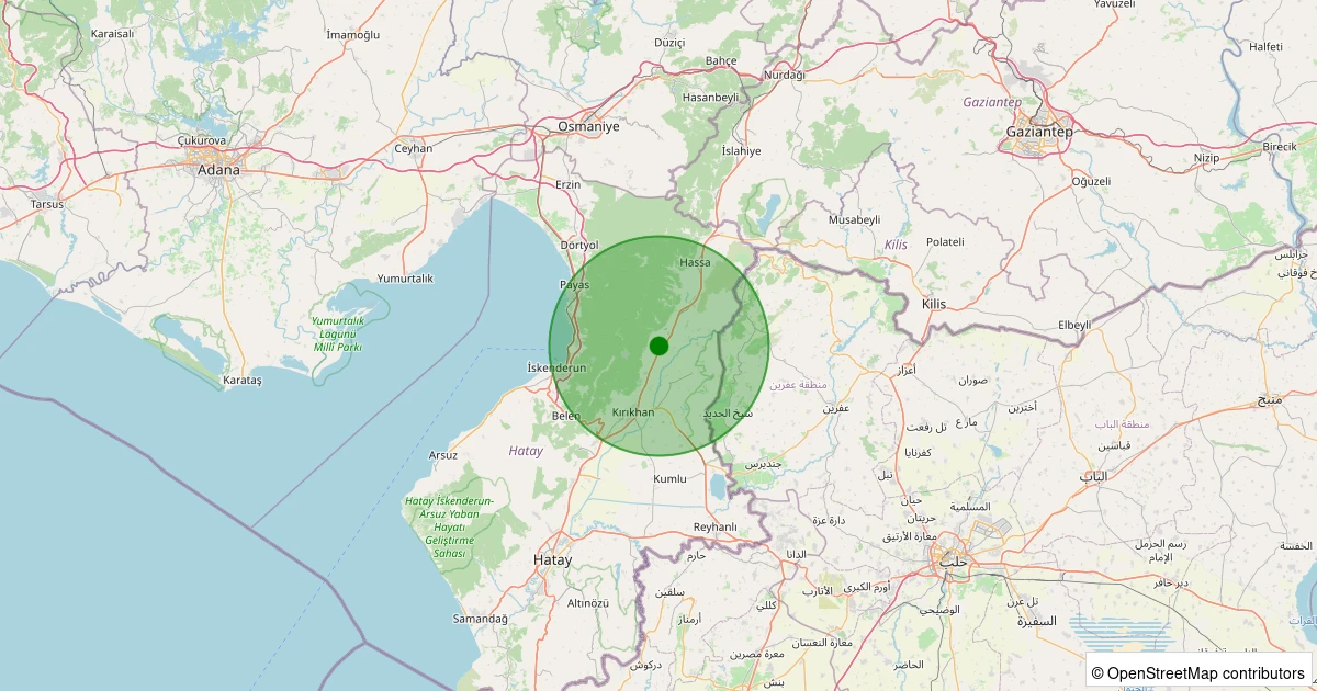 Son 7 gün içinde Kırıkhan - Bektaşlı Köyü noktasından 100 km yarıçap içerisinde meydana gelen diğer depremler: