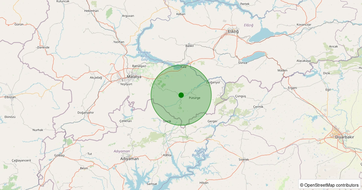 Son 7 gün içinde Pütürge - Pazarcık Köyü noktasından 100 km yarıçap içerisinde meydana gelen diğer depremler: