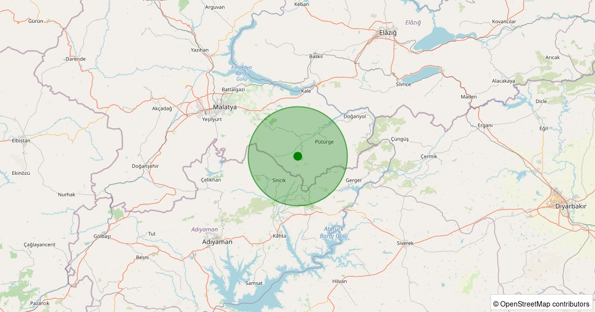 Son 7 gün içinde Pütürge - Yazıca Köyü noktasından 100 km yarıçap içerisinde meydana gelen diğer depremler: