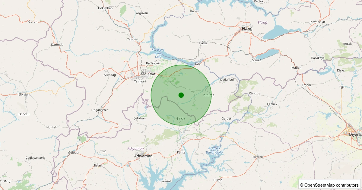 Son 7 gün içinde Pütürge - Tekederesi Köyü noktasından 100 km yarıçap içerisinde meydana gelen diğer depremler: