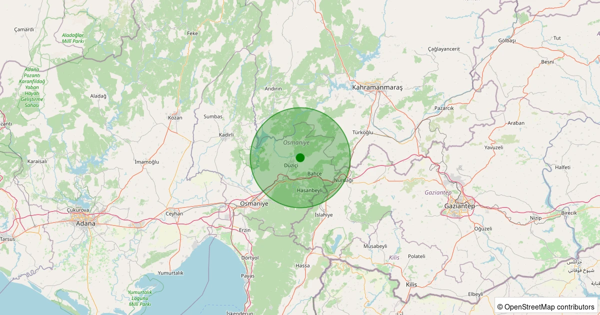 Son 7 gün içinde Düziçi - Çatak Köyü noktasından 100 km yarıçap içerisinde meydana gelen diğer depremler: