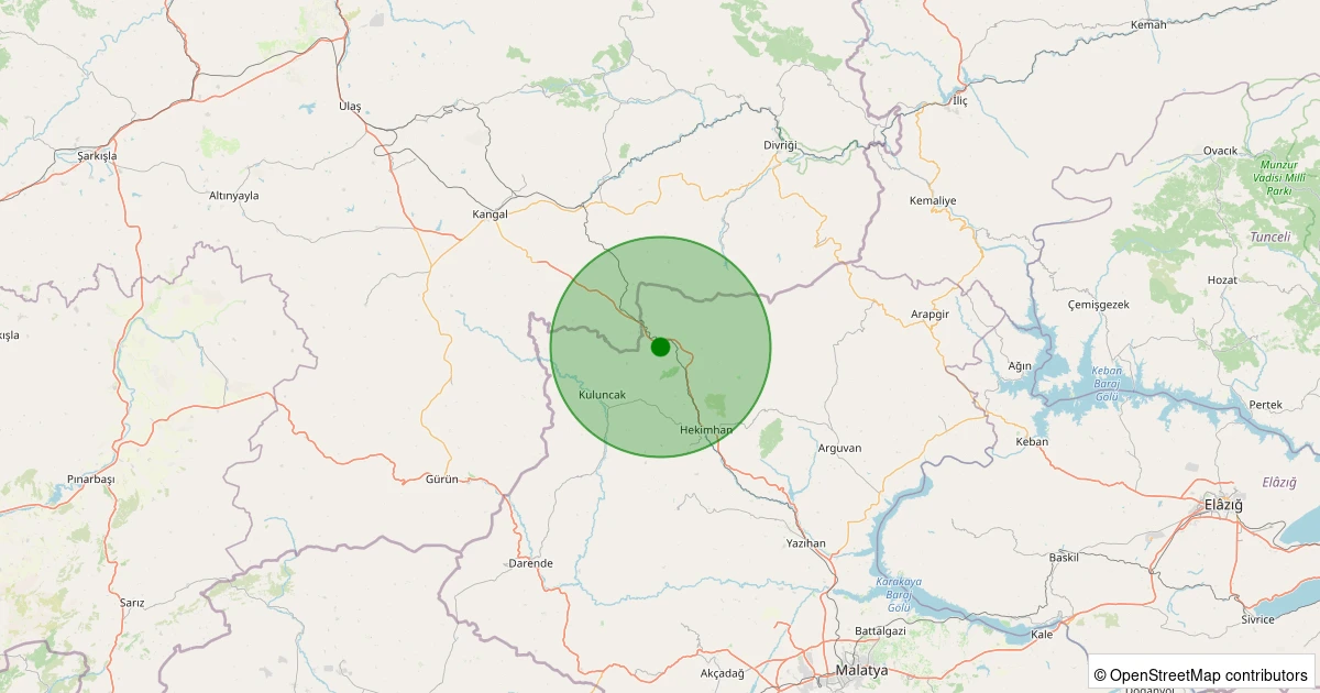 Son 7 gün içinde Hekimhan - Hasançelebi Köyü noktasından 100 km yarıçap içerisinde meydana gelen diğer depremler: