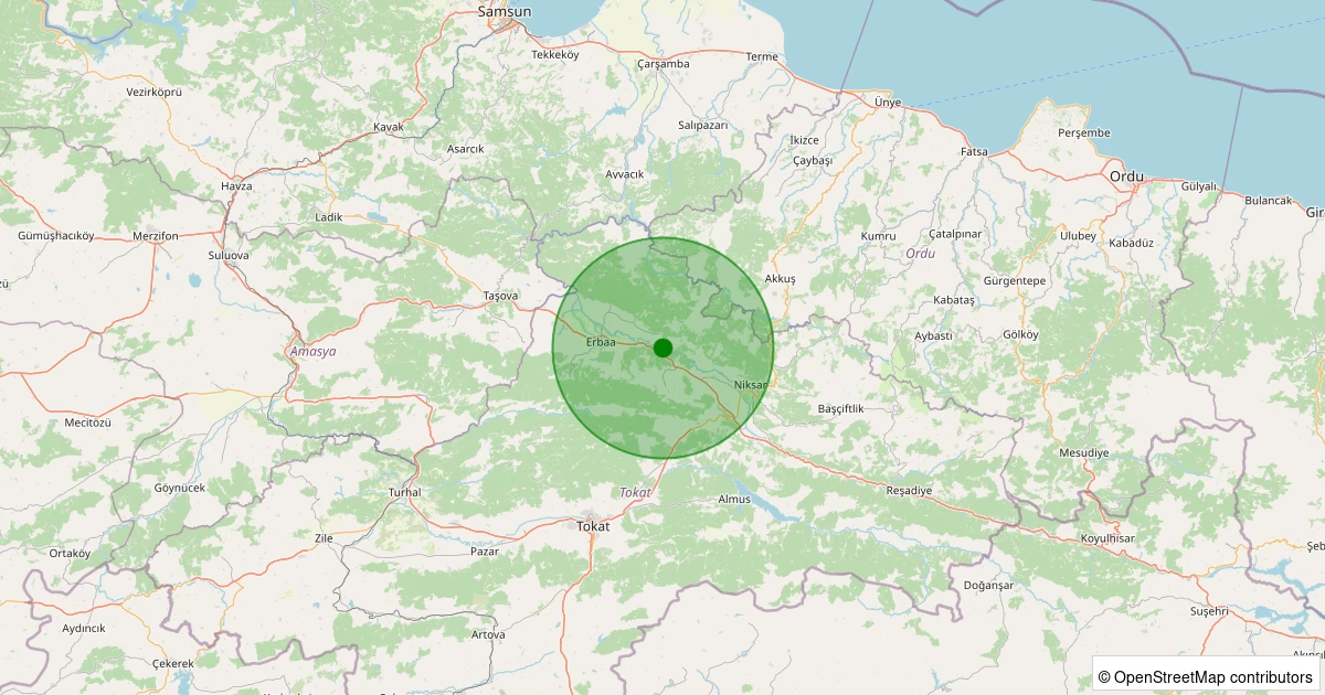 Son 7 gün içinde Erbaa - Ayan Köyü noktasından 100 km yarıçap içerisinde meydana gelen diğer depremler: