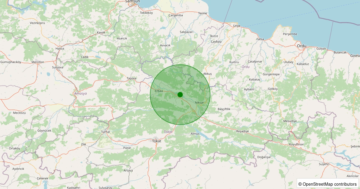 Son 7 gün içinde Niksar - Kümbetli Köyü noktasından 100 km yarıçap içerisinde meydana gelen diğer depremler: