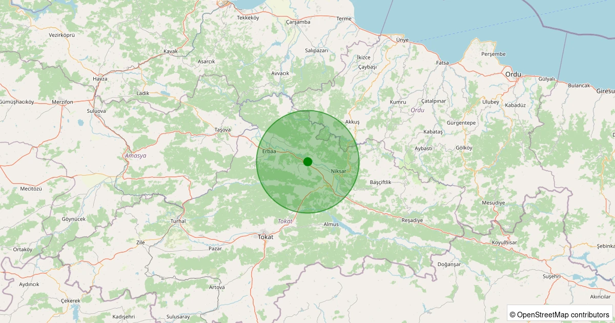 Son 7 gün içinde Niksar - Kümbetli Köyü noktasından 100 km yarıçap içerisinde meydana gelen diğer depremler: