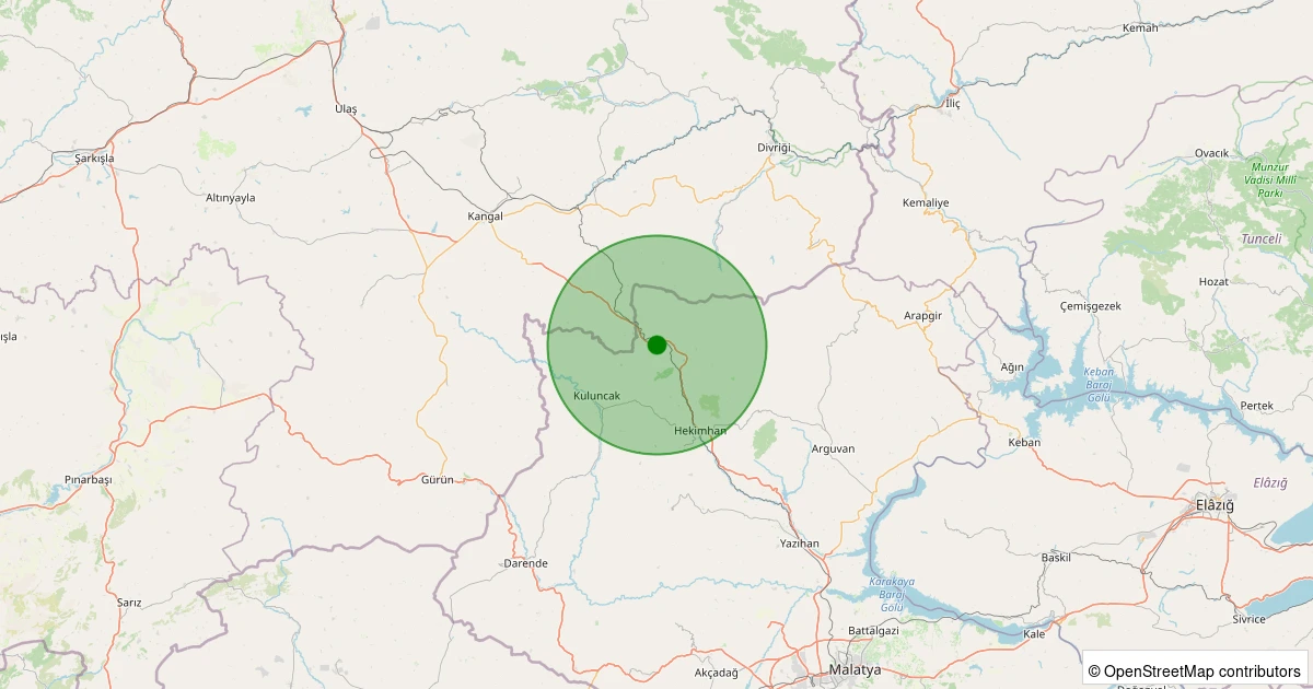 Son 7 gün içinde Hekimhan - Hasançelebi Köyü noktasından 100 km yarıçap içerisinde meydana gelen diğer depremler: