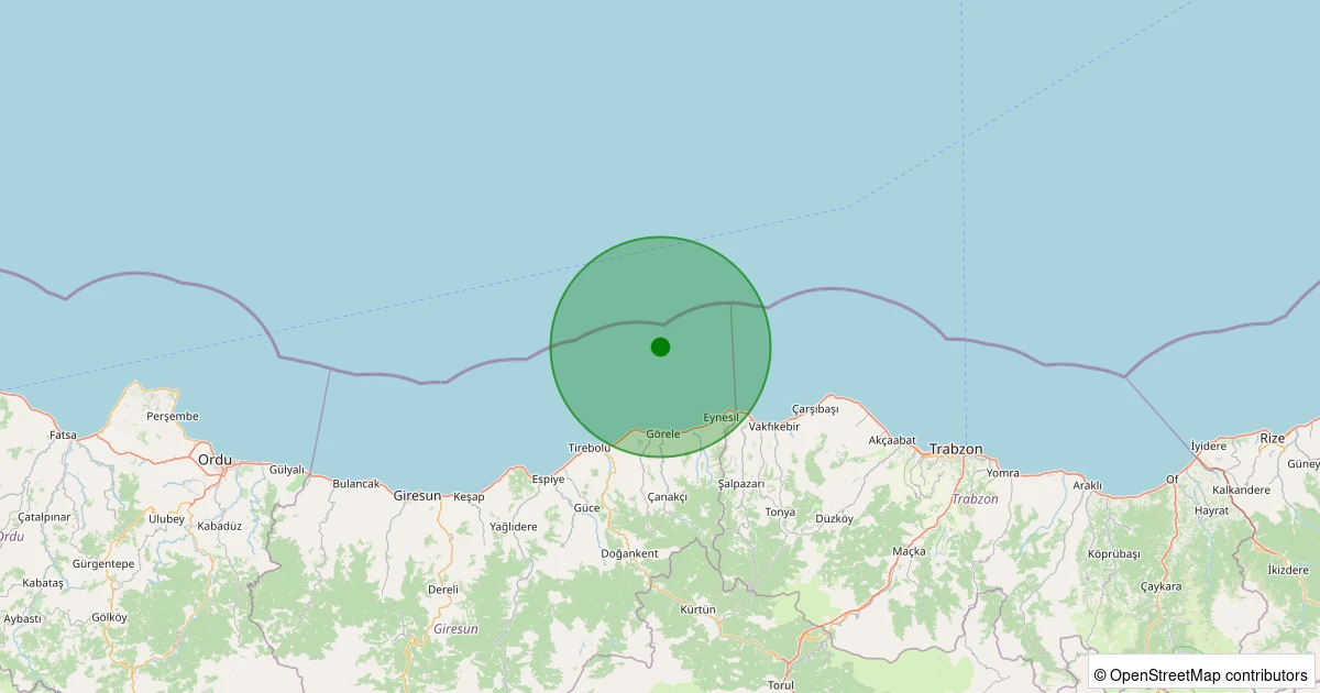 Son bir hafta içerisinde Karadeniz - [18.22 km] Görele (Giresun) noktasından 100 km yarıçap içerisinde toplamda 7 deprem kaydedilmiştir. Bu depremlerden en büyüğü 3.6 büyüklüğünde ve en sığ odaklısı 6.94 kilometre derinlikte gerçekleşmiştir.