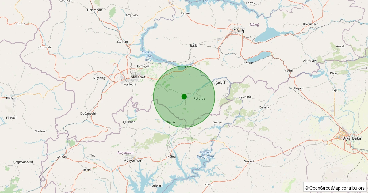 Son 7 gün içinde Pütürge - Pazarcık Köyü noktasından 100 km yarıçap içerisinde meydana gelen diğer depremler: