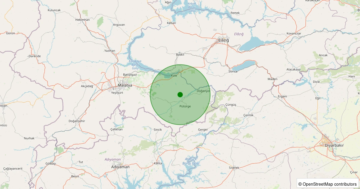 Son 7 gün içinde Pütürge - Karşıyaka Köyü noktasından 100 km yarıçap içerisinde meydana gelen diğer depremler: