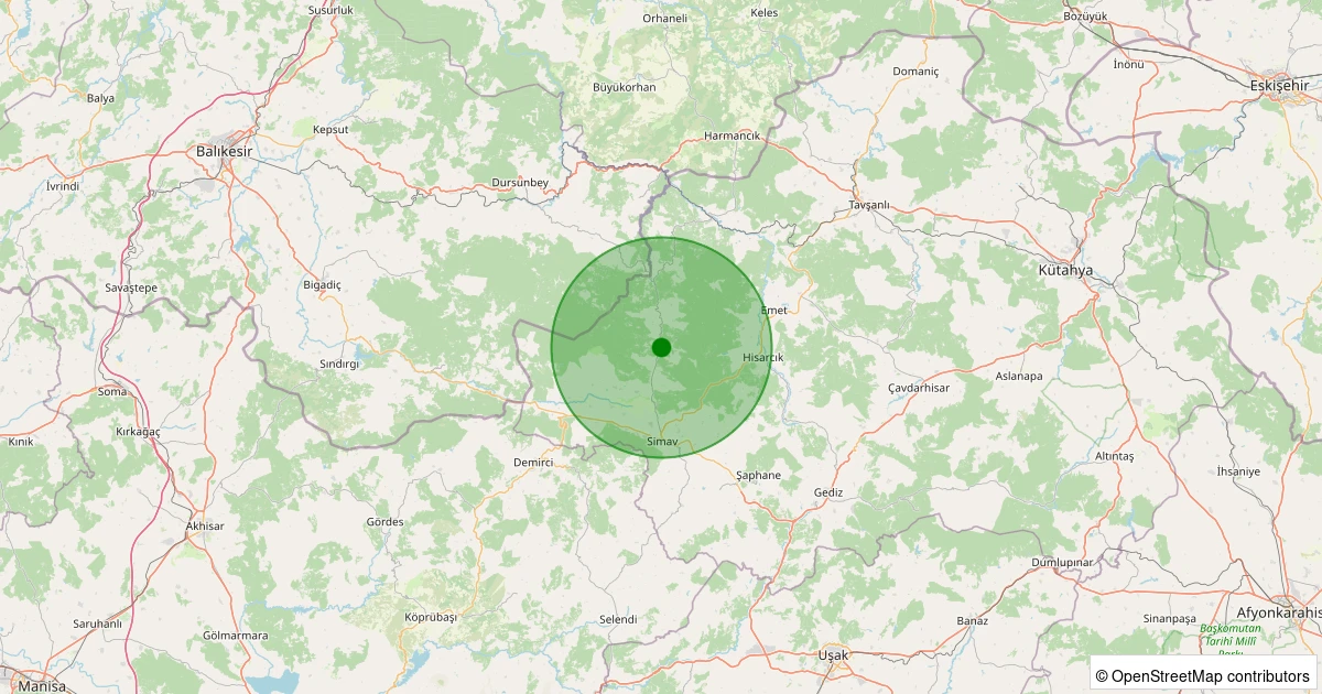 Son 7 gün içinde Simav - Yeşildere Köyü noktasından 100 km yarıçap içerisinde meydana gelen diğer depremler:
