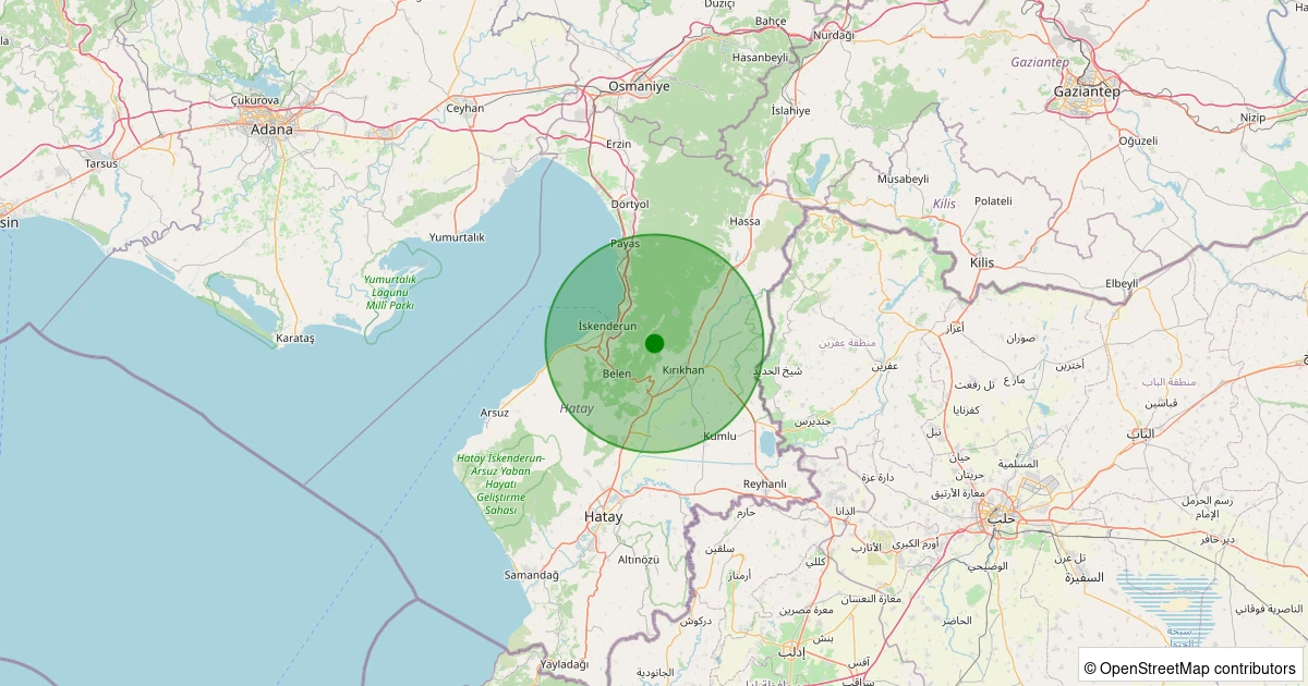 Son 7 gün içinde Kırıkhan - Delibekirli Köyü noktasından 100 km yarıçap içerisinde meydana gelen diğer depremler: