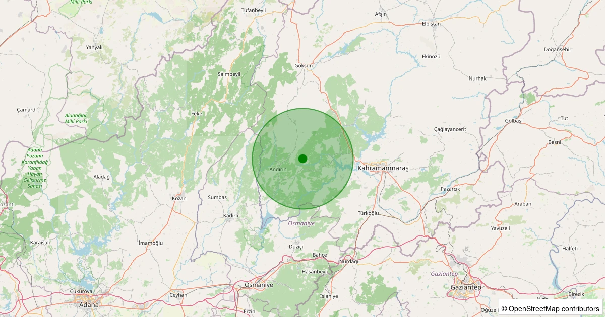 Son 7 gün içinde Andırın - Gökgedik Köyü noktasından 100 km yarıçap içerisinde meydana gelen diğer depremler: