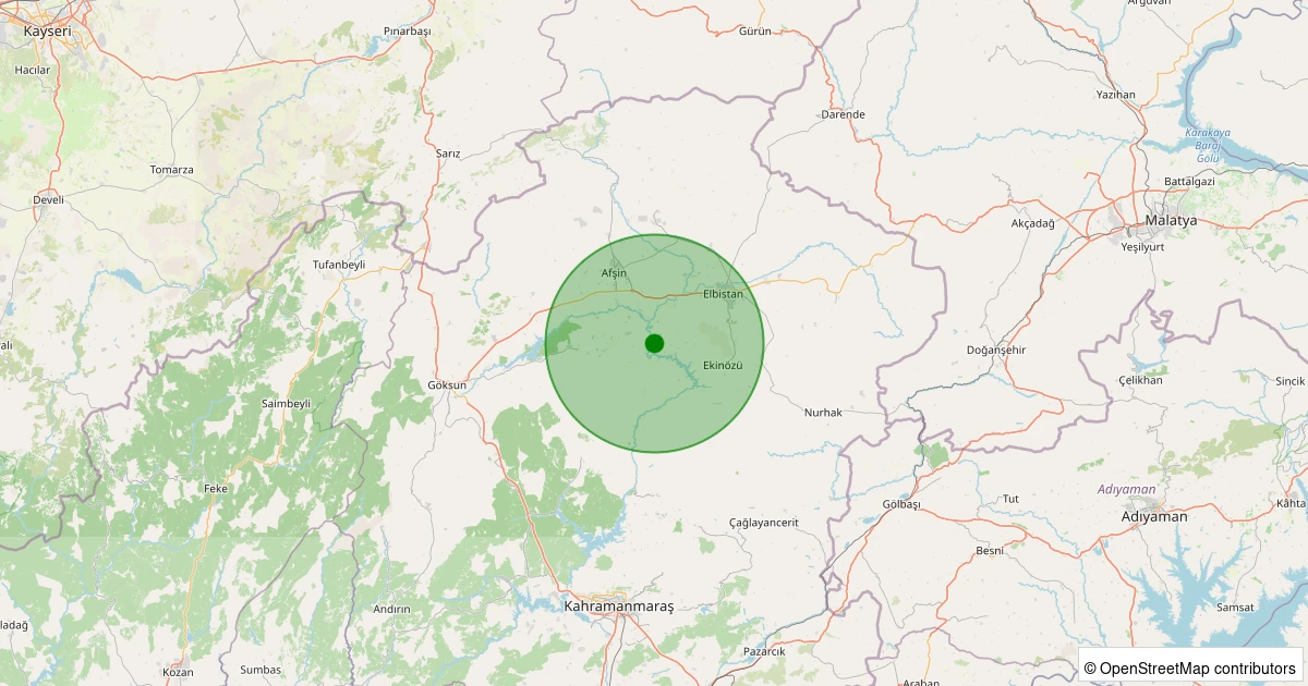 Son 7 gün içinde Elbistan - Dağdere Köyü noktasından 100 km yarıçap içerisinde meydana gelen diğer depremler: