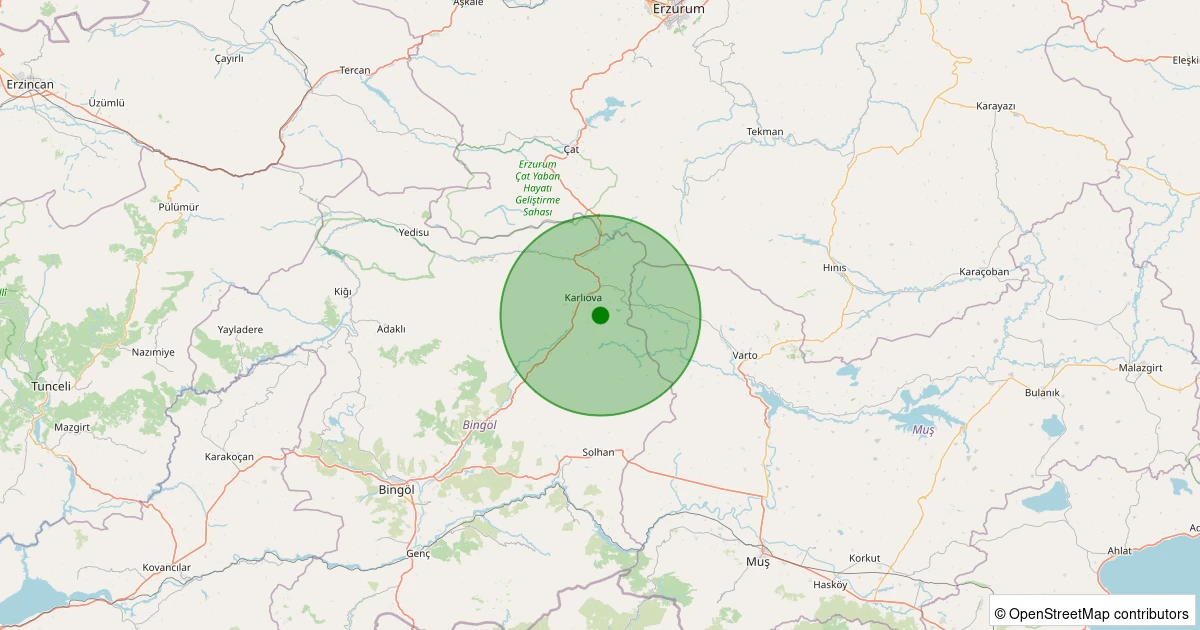 Son 7 gün içinde Karlıova - Serpmekaya Köyü noktasından 100 km yarıçap içerisinde meydana gelen diğer depremler: