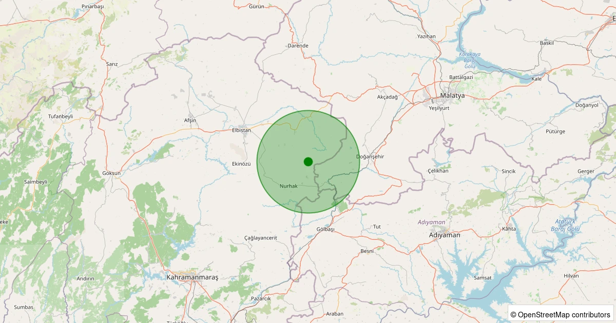 Son 7 gün içinde Nurhak - K.Tatlar Pınarbaşı noktasından 100 km yarıçap içerisinde meydana gelen diğer depremler: