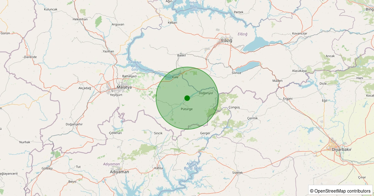 Son 7 gün içinde Pütürge - Gündeğer Köyü noktasından 100 km yarıçap içerisinde meydana gelen diğer depremler: