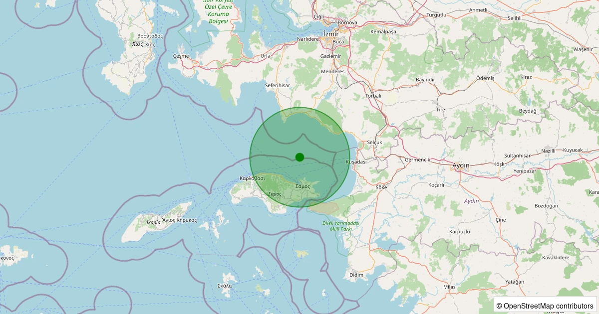 Son bir hafta içerisinde Ege Denizi - Kuşadası Körfezi - [19.69 km] Menderes (İzmir) noktasından 100 km yarıçap içerisinde toplamda 55 deprem kaydedilmiştir. Bu depremlerden en büyüğü 2.1 büyüklüğünde ve en sığ odaklısı 3.10 kilometre derinlikte gerçekleşmiştir.
