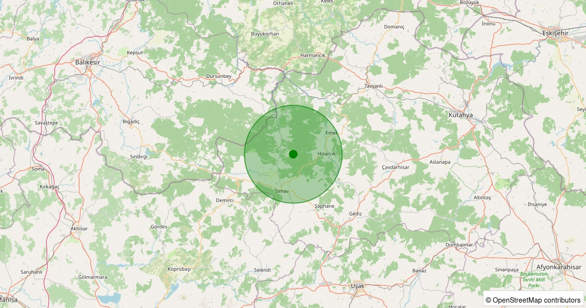 Son 7 gün içinde Simav - Yeşildere Köyü noktasından 100 km yarıçap içerisinde meydana gelen diğer depremler: