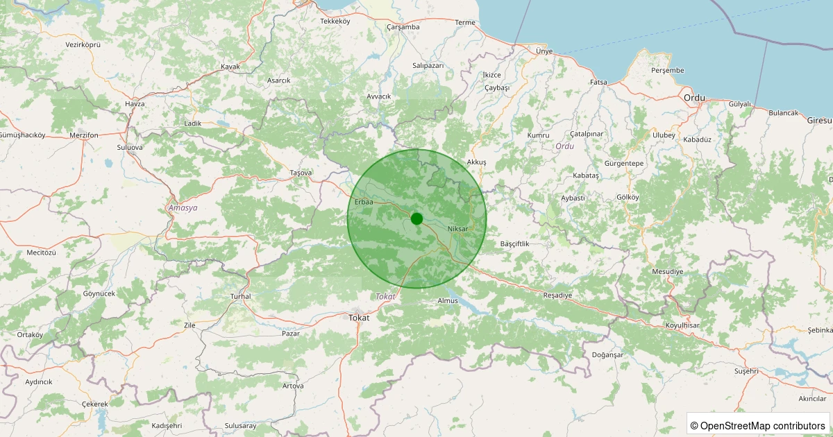 Son 7 gün içinde Niksar - Kümbetli Köyü noktasından 100 km yarıçap içerisinde meydana gelen diğer depremler: